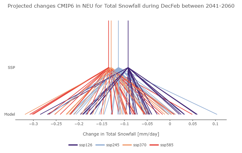 The figure below is obtained by selecting the change in Total Precipitation for the season Mar-May for the year 2041 for the NEU region. We notice that that the individual model projections span a much larger range of change than the SSP averaged scenarios. Here we see that individual models behave differently towards the same emission scenarios. This can be either due to differences in the way they represent physical processes or because they are subject to randomness of the weather and might have hit a cold snap or dry spell in their simulations.