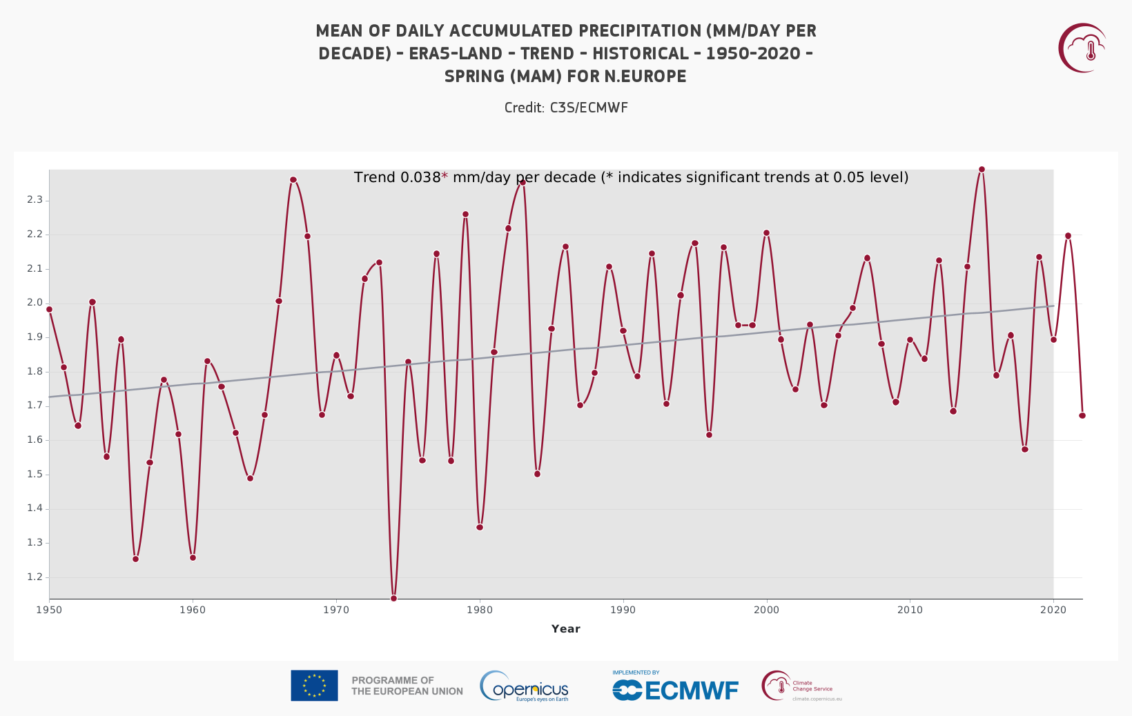 As Latvia is situated on the border between NEU and WCE we need to choose which region. Since the European risk assessment considers the Baltic states to be part of NEU we also choose this region. The graphs below are obtained frpm https://atlas.climate.copernicus.eu/atlas. Overall, there has been an upward trend in ERA5 data for precipitation as can be seen from the graph.