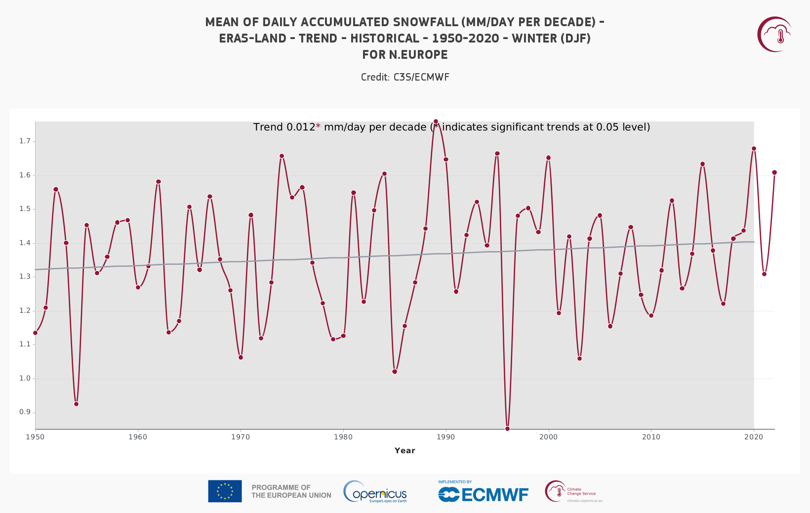 In the whole of NEU we find that snow has a slightly increasing trend. The increasing rainfall trend might have contributed to more snow accumulation than temperature increases have reduced snow accumulation.
